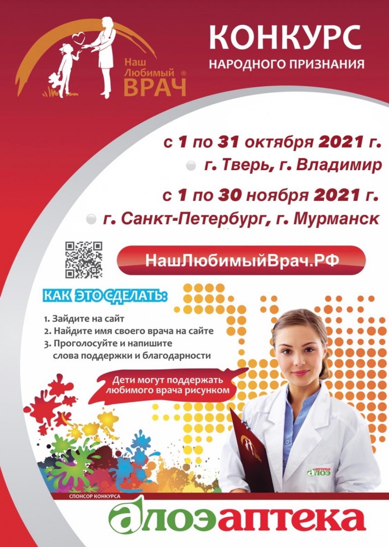 |  | Наш любимый врач В этом году конкурс народного признания "Наш Любимый ВРАЧ" пройдёт не только по традиции в Санкт-Петербурге, но и в трёх других городах нашей страны — Твери, Владимире и Мурманске!⠀У жителей Твери и Владимира возможность отблагодарить любимых врачей появится уже совсем ...