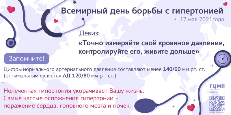 |  | 17 мая - Всемирным днем борьбы с гипертонией По инициативе Всемирной лиги по гипертонии (World Hypertension League) – головной организации, объединяющей национальные лиги гипертонии и сообщества по всему миру, 17 мая объявлен Всемирным днем борьбы с гипертонией.