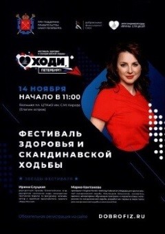 |  | Фестиваль здоровья и скандинавской ходьбы «Ходи, Петербург!» 14 ноября в 11.00 в ЦПКиО им. С.М. Кирова под эгидой Добровольного физкультурного союза заслуженного мастера спорта России Ириной Слуцкой состоится Фестиваль здоровья и скандинавской ходьбы «Ходи, Петербург!»
