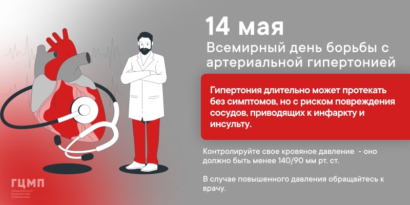 |  | Ко Всемирному дню борьбы с артериальной гипертонией – 14 мая 2022 Ежегодно во вторую субботу мая отмечается Всемирный день борьбы с артериальной гипертонией, который проводится с 2005 года по инициативе Всемирной лиги борьбы с гипертонией при поддержке Всемирной организации здравоохранения.В 2022 году Всемирный день борьбы с ...